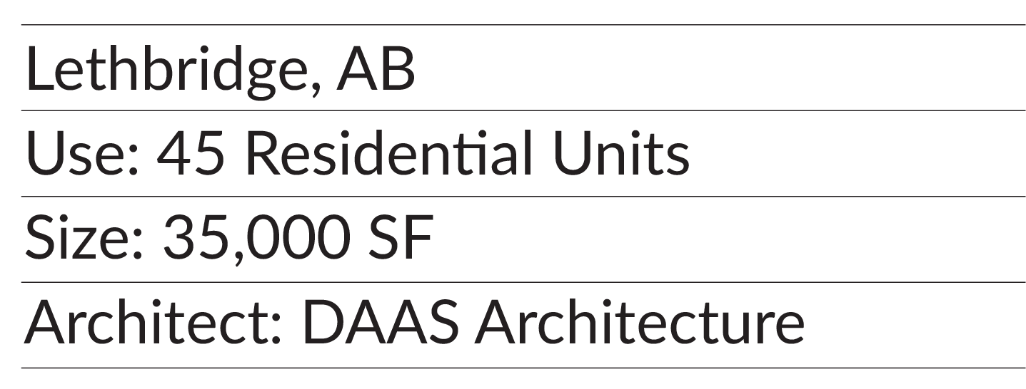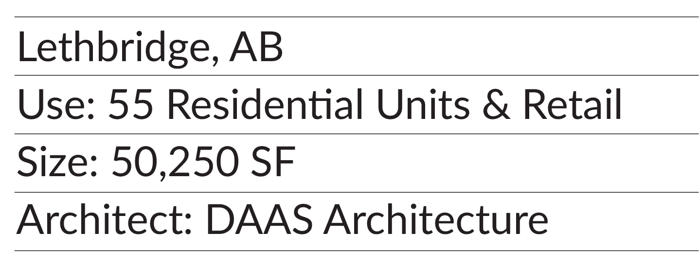 Five levels of purpose-built rental on top of ground floor retail. This development combines the conveniences of downtown living, while offering direct access to downtown Lethbridge’s largest park.